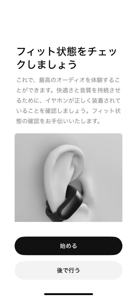 初期設定でイヤホンの接続・耳のフィット状況のチェックができます。