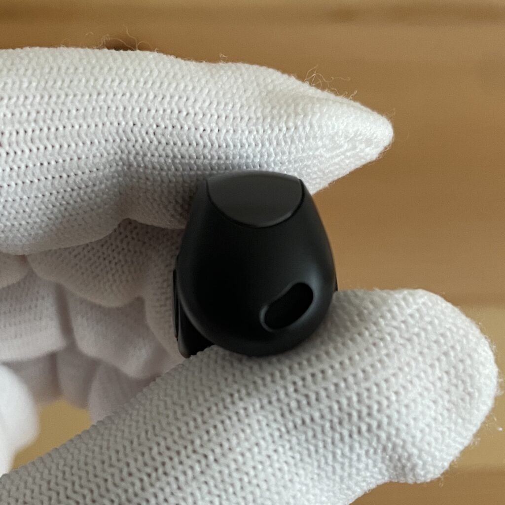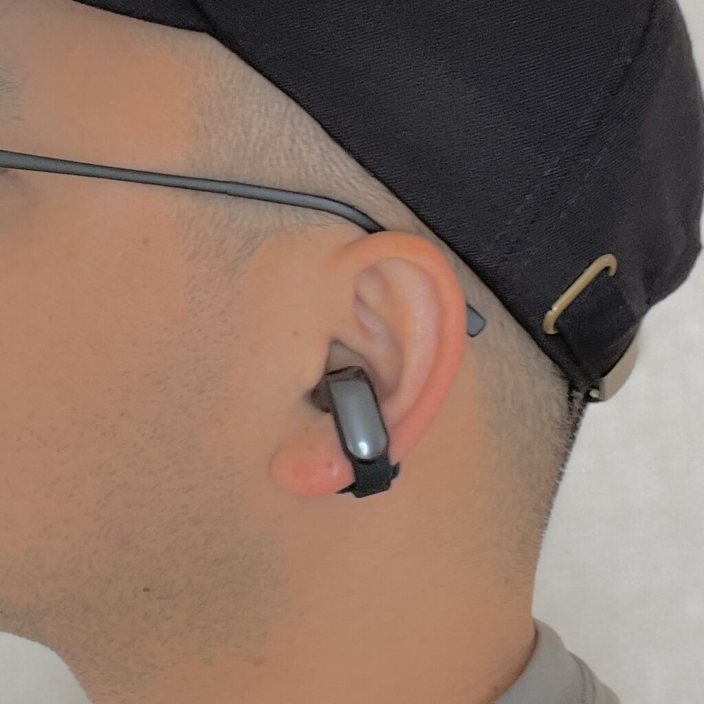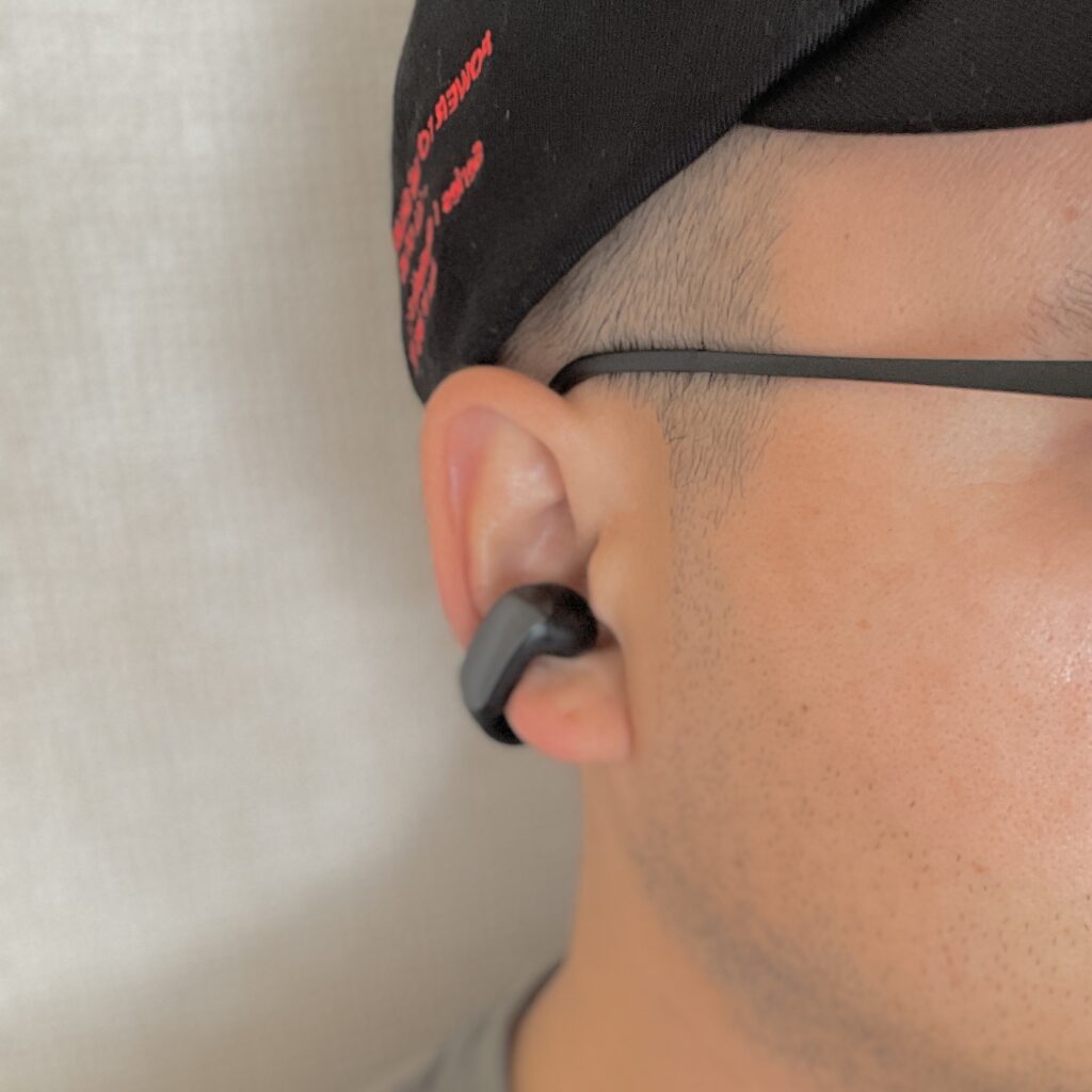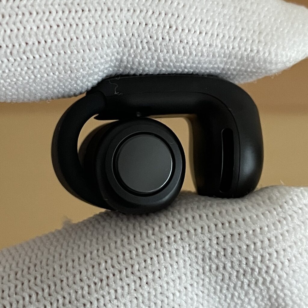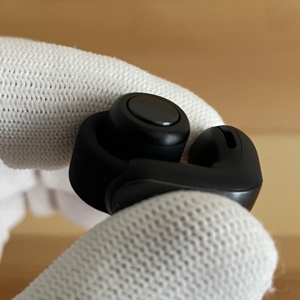 ボディは他のイヤーカフ型イヤホンと比較しても存在感のある太めのデザイン。個人的には太めのTシャツと相性が良いと感じました。