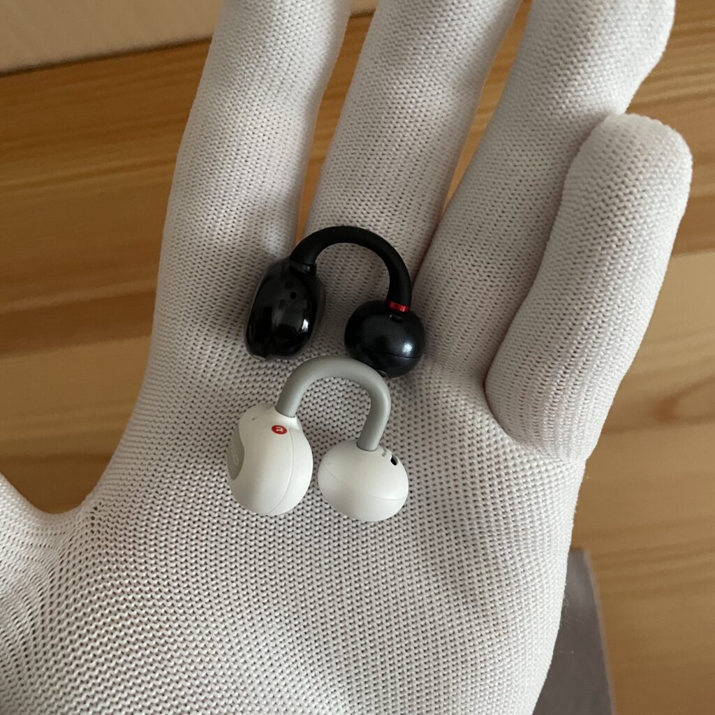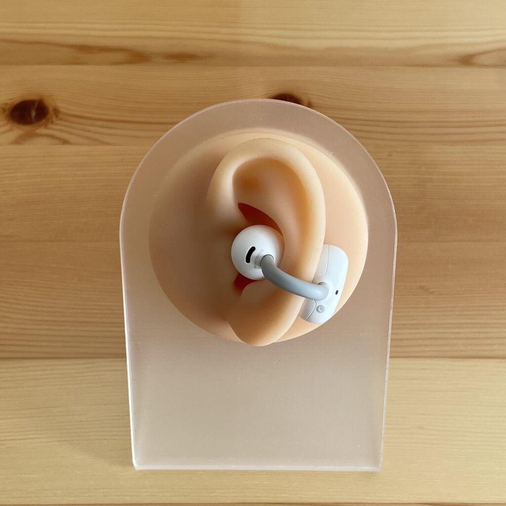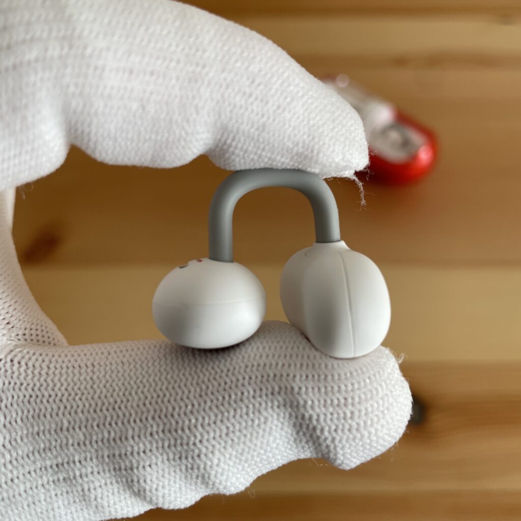 1つは、耳の穴に結構入り込んでくる感覚がありました。オープンイヤーであるものの他のイヤカフ型イヤホンに比べて、スピーカーの球体部分と耳穴の設置部分が広いと感じました。