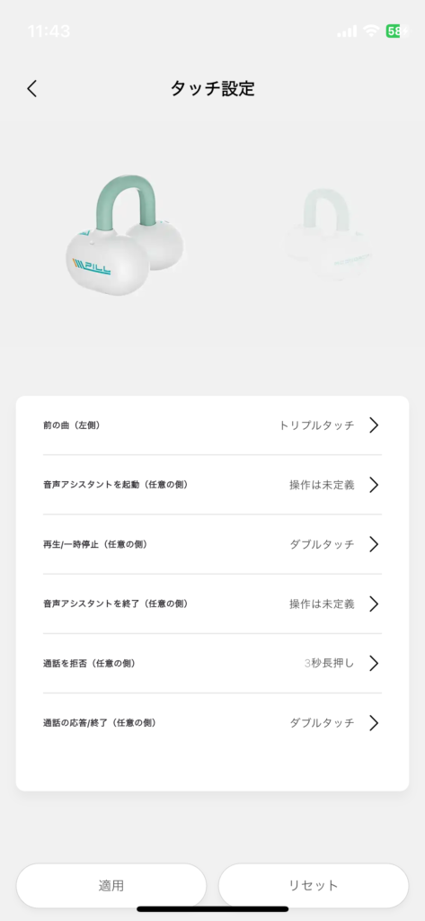 →イヤホンの画像をタッチすることで、タッチ操作の定義を設定できます。